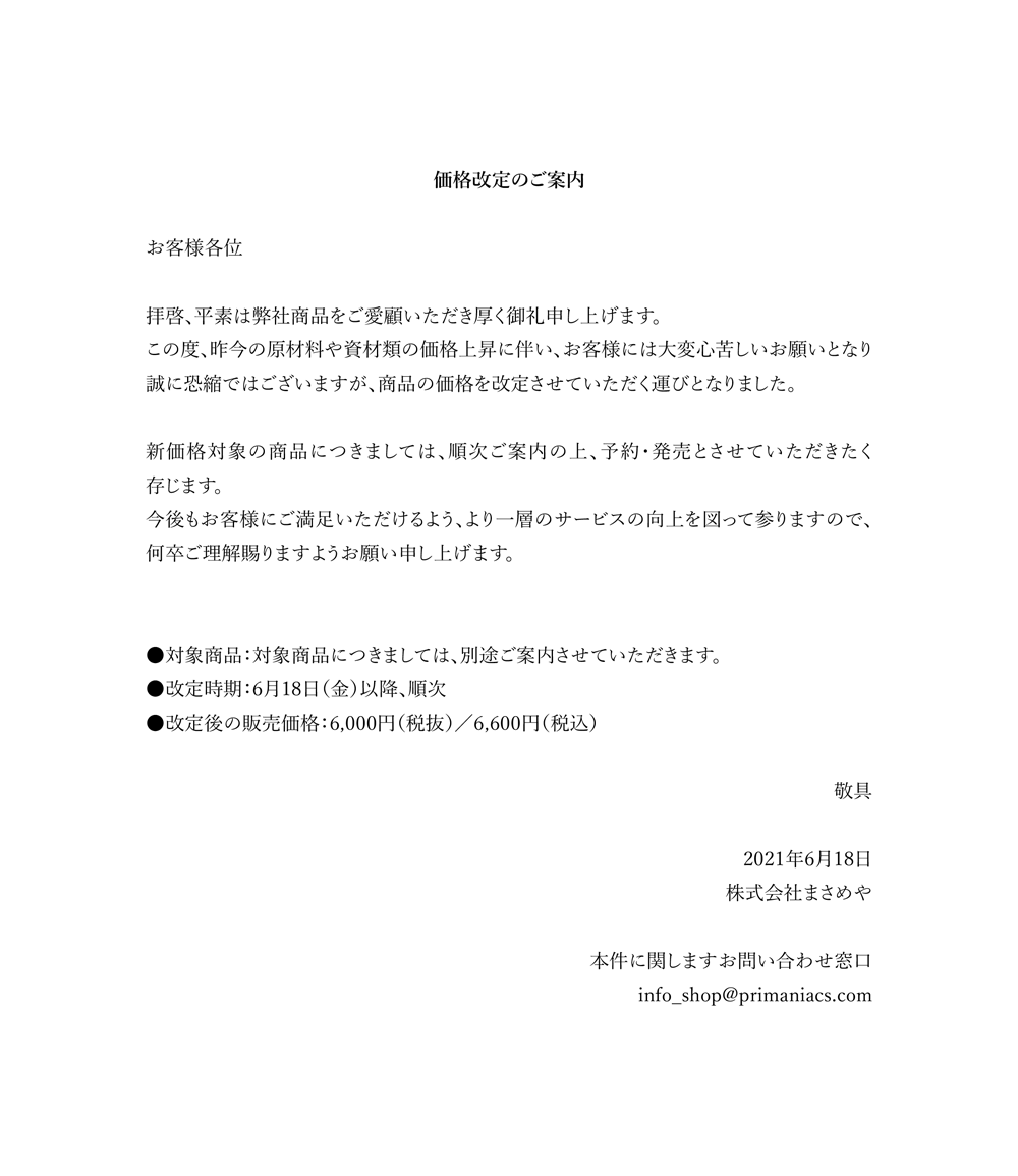 お客様各位 拝啓、平素は弊社商品をご愛顧いただき厚く御礼申し上げます。 この度、諸般の事情により、商品の価格を改定させていただく運びとなりました。 お客様には大変心苦しいお願いとなり恐れ入りますが、何卒ご理解賜りますようお願い申し上げます。